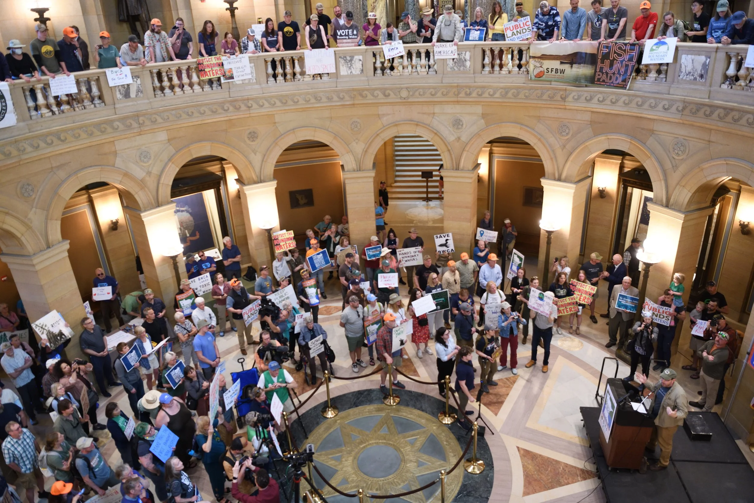 About 300 people filled the Minnesota State Capitol Rotunda Thursday to protest the assault that U.S. House Rep. Pete Stauber (R-Duluth), Republicans and the Trump Administration are waging on Minnesota’s crown jewel: the Boundary Waters Canoe Area Wilderness, the vast, undeveloped and sensitive lake country along the border of Canada.